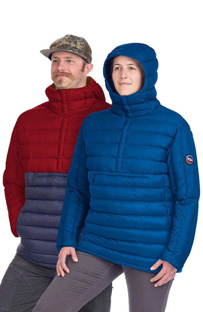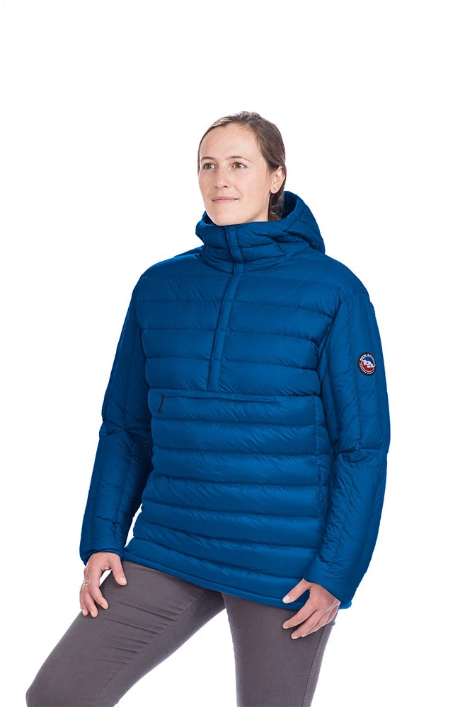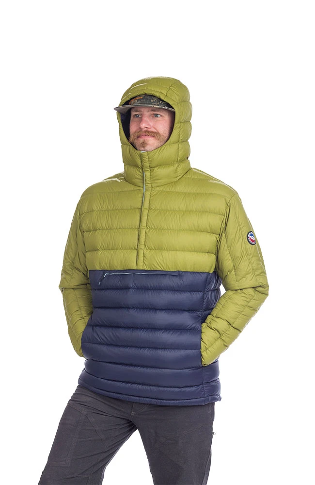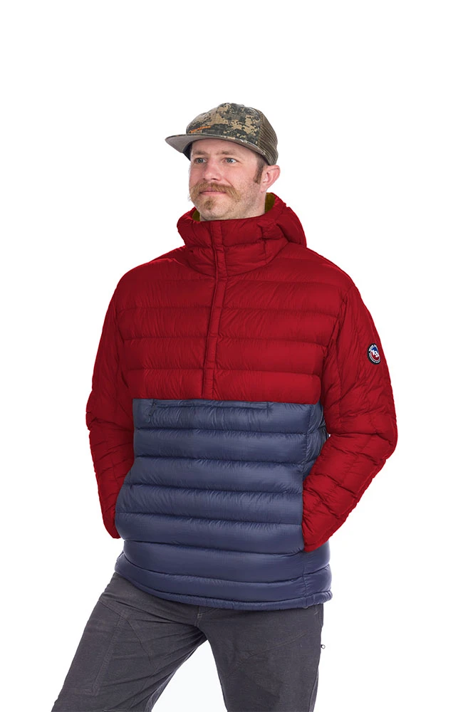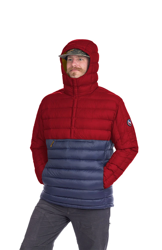 Relaxed pullover, unisex fit with body mapped vertical baffles on the sleeves for better thermal performance and horizontal quilting across the torso and back to ensure down stays close to the body.