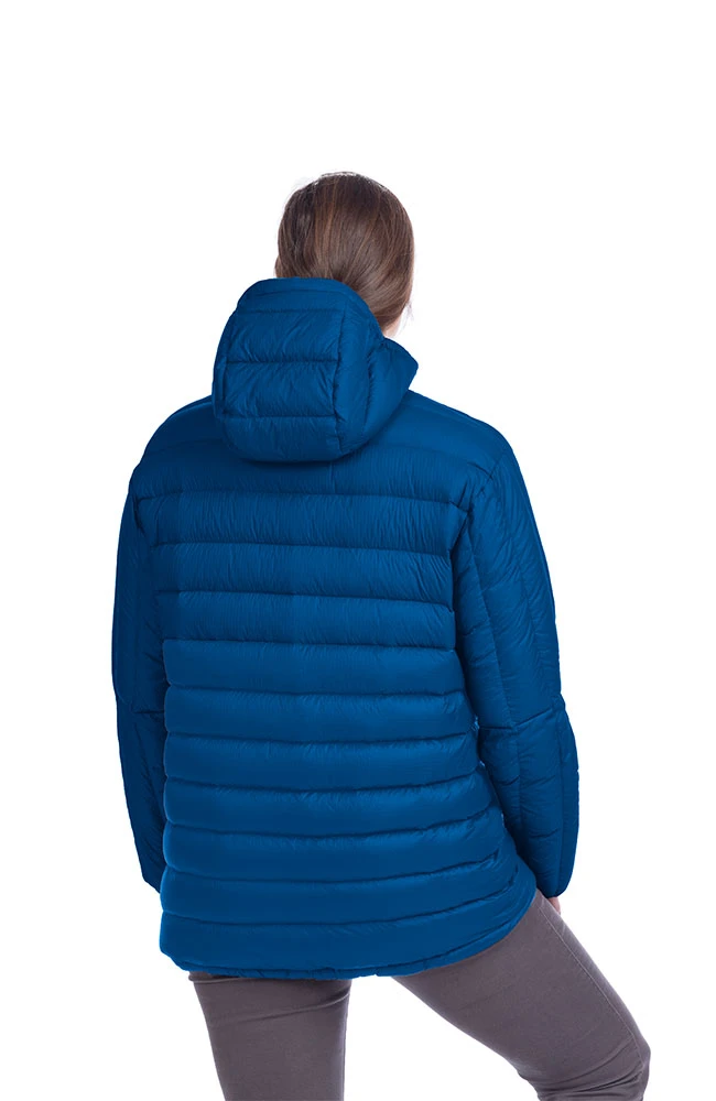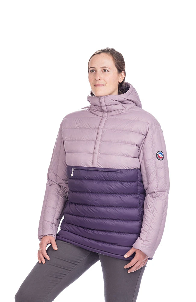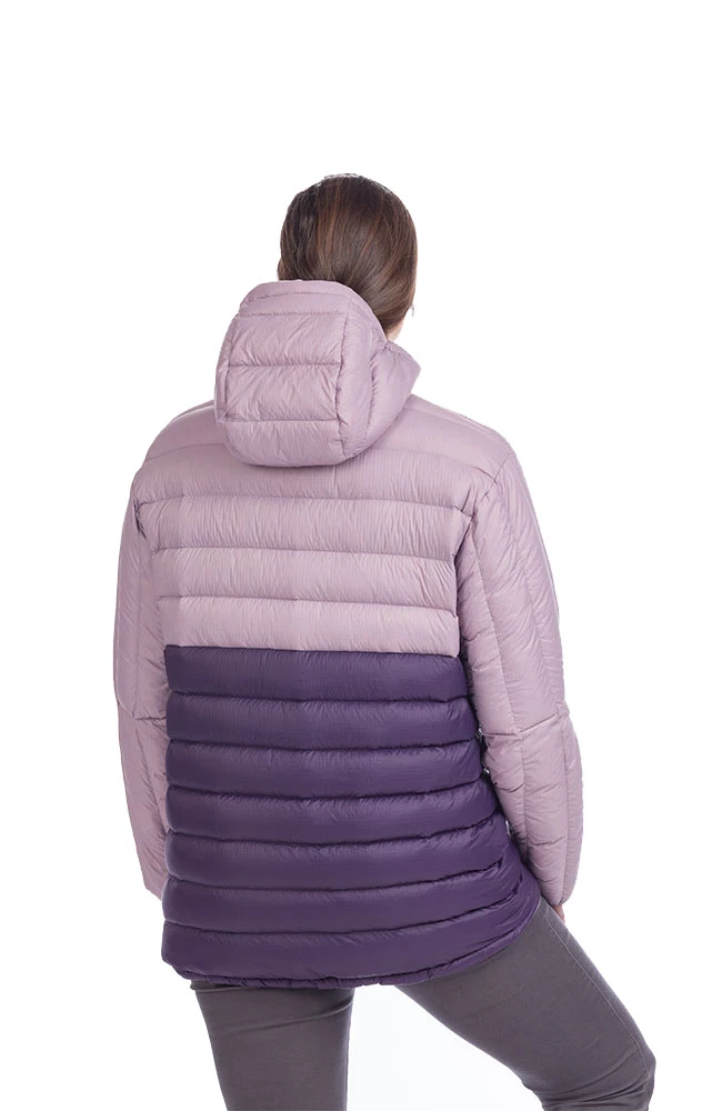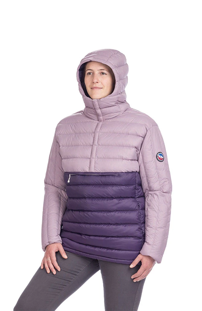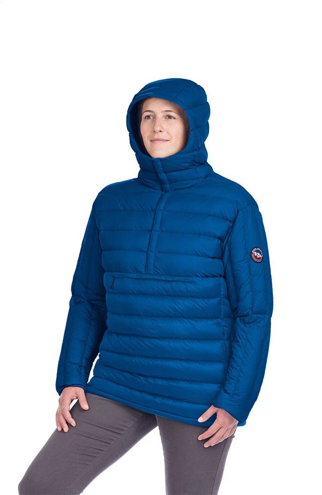 Relaxed pullover, unisex fit with body mapped vertical baffles on the sleeves for better thermal performance and horizontal quilting across the torso and back to ensure down stays close to the body.